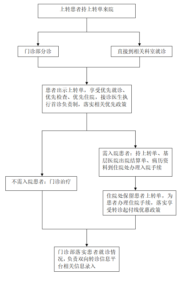 双向转诊制度 双向转诊服务内容: 1.为加强与基层卫生服务机构及上级医院的医疗技术协作与业务交流,合理利用卫生资源,实现大病在医院、小病在社区的工作目标,为患者提供安全、有效、便捷、经济的医疗服务,特制定本制度。 2. 逐步建立服务规范、运转有效的双向转诊网络 医院患者下转以乡镇卫生院及周边社区卫生服务中心;上转以省内外三级医院为依托,加强技术协作与交流,达到以患者为中心,提高医院医疗与服务质量,构建和谐医患关系。 3. 双向转诊原则 3.1 患者自愿的原则:从维护患者利益出发,充分尊重患者的选择权,切实当好患者的“参谋”。 3.2 分级诊治的原则:小病、常见病在基层、社区,危急重症在上级医院。 3.3 就近转诊的原则:根据患者病情和和医疗机构服务可及性,就近转诊患者,做到方便、快捷。 3.4 针对性和有效性原则:根据患者的病情有选择地将患者转诊至专科、专病特色明显的医疗机构,提高患者诊治的有效性。 3.5 无缝式管理的原则:建立起有效、严密、实用、畅通的上下转诊渠道,为患者提供整体性、持续性的医疗服务。 4. 双向转诊临床标准 4.1 上转指征(除急诊抢救外) 4.1.1 临床危急重症,医院因医疗设备及技术条件难以实施有效救治的病例; 4.1.2 不能确诊的疑难复杂病例; 4.1.3 重大伤亡事件中,处置能力受限的病例; 4.1.4 疾病诊治超出核准诊疗登记科目的病例; 4.1.5 因技术、设备条件限制不能明确诊断或处置的病例; 4.1.6 根据有关法律法规,需转入专业性防治机构治疗的病例。 4.2 下转指征: 4.2.1 急性期治疗后病情稳定,需要继续康复治疗的病例; 4.2.2 诊断明确,不需特殊治疗的病例; 4.2.3 各种恶性肿瘤患者的晚期非手术治疗和临终关怀。 4.2.4 需要长期治疗和护理的病情稳定的慢性病病例。 4.2.5 可在基层医疗机构诊治的一般常见病、多发病病例。 4.2.6 自愿要求转回基层医疗机构者。 5. 双向转诊管理规范 5.1 双向转诊医院自觉遵守《乳山市综合医疗联合体协议书》中双向转诊方面双方的权利和义务,以确保转诊的畅通。 5.2 双向转诊办公室设在门诊部,门诊部负责双向转诊信息系统处理。 5.3 转出患者出院记录必须详尽,出院当日将“长期医嘱单、临时医嘱单、出院小结及阳性检查结果”打印或复印后粘贴在门诊病历后面带到接诊医院就诊。 5.4 必要时转诊医生与接诊医院电话沟通,交代患者病情、诊疗措施、转运等相关事宜;对于病情较重患者,必要时派医护人员护送,以确保患者途中安全。。 5.5 医院对转入患者实行优先就诊、优先检查、优先住院等优先政策。 5.6 实行资源共享,对上转来的患者根据病情合理检查、合理诊断、合理治疗,不作不必要的重复检查。 5.7 对于在协作单位抢救的患者,如需要医院支援,医院在接到邀请后应立即派出医务人员出诊,就地参与抢救。需要转院的患者可直接送医院治疗。协作医院对疑难杂症提出会诊要求者,医院委派相关专家前往会诊,无特殊原因不得推诿。 5.8 患者转诊期间,转诊医生和患者保持联系,以便开展连续性的照顾与服务。 5.9 严格遵循双向转诊上转和下转指征,合理转诊患者。 5.10 完善双向转诊的医保引导政策。对按规定办理双向转诊手续的参保患者,做好享受转诊起付线优惠政策宣教工作,并落实患者是否按规定办理入院手续。 双向转诊流程图(上转) 科室下转病人需注意以下几个方面: 1、下转病人需备齐:转诊单、结算清单、门诊病历。 2、主管大夫与转诊医院沟通:患者的病情、治疗及转运等。 3、电话通知门诊部,并将转诊单发在门诊部工作人员的内网邮箱。门诊部将录入平台,并下发给转诊医院。 4、患者的信息要登记准确,尤其是联络方式、下转医院等,门诊部将根据这些信息落实该患者是否到转诊医院住院,并实时统计住院的下转病人。 5、各乡镇负责双向转诊的工作人员联络方式已发在内网的通知公告和门诊部公共文件柜内,望下载使用。 6、下转单模板请从门诊部公共文件柜内下载使用。 7、转诊大夫的联系方式请填全号。 8、双向转诊病人要求首诊医院出院当日需要把“长期医嘱单、临时医嘱单、出院小结及阳性检查结果”打印或复印后粘帖在门诊病历后面带到上转或下转医院就诊。 (请务必告知患者及家属,下转单要到住院部一楼西医保办盖章,否则医保部门审核不通过,不能享受起付线优惠政策) 双向转诊下转机构名单 城中社区卫生服务中心 乳山市第二人民医院 乳山市南黄中心医院 乳山市崖子镇中心卫生院 乳山市徐家镇卫生院 乳山市育黎镇卫生院 乳山市大孤山卫生院 乳山市乳山寨镇卫生院 乳山市午极镇卫生院 乳山市诸往镇卫生院 乳山市人民医院双向转诊联系方式:(仅限工作日) |