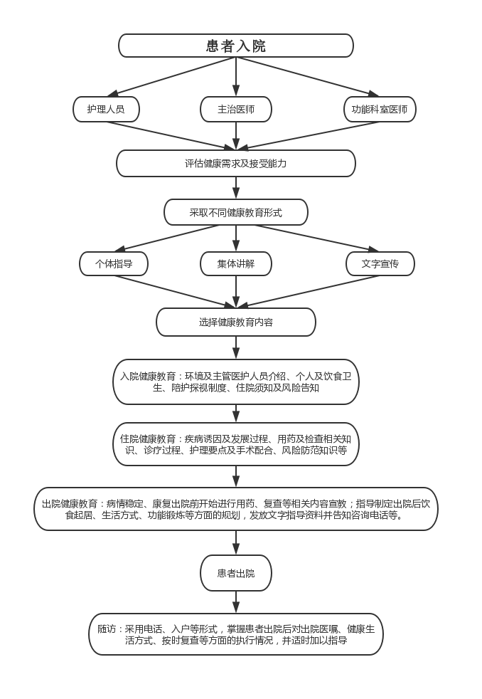患者健康教育制度 一、医护人员对住院及门诊就诊患者进行健康教育。 二、健康教育方式。 (一)个体指导内容包括一般卫生知识,如个人卫生、公共卫生、饮食卫生、常见病、多发病、季节性传染病的防病知识,急救常识、妇幼卫生、婴儿保健、计划生育等知识。在为患者诊疗时,结合病情、家庭情况和生活条件做具体指导。 (二)集体讲解门诊患者可利用候诊时间,住院患者根据作息时间。采取集中讲解、示范、模拟操作相结合及播放电视录像等形式进行。 (三)文字宣传以黑板报、宣传栏、编写短文、健康教育处方、图画、诗歌等形式进行。 (四)座谈会。在患者病情允许的情况下,医护人员组织患者对主题讨论并回答患者提出的问题。 (五)视听材料。利用幻灯、投影、录像、电视、广播等视听设备在病房、候诊大厅等患者活动区域进行宣教。 三、健康教育内容 (一)住院患者健康教育内容: 1.医院规章制度:如查房时间、探视制度、陪护制度等; 2.病室环境:作息时间、卫生间使用、贵重物品的保管及安全注意事项、预防跌倒知识、呼叫器的使用等; 3.相关疾病知识宣教:相关检查、治疗、用药治疗介绍指导,围手术期宣教、疼痛管理、康复技术指导、安全有效使用医疗器械等; 4.出院指导:持续用药指导,饮食、活动、休息的要求和注意事项,复诊时间安排和重要性等。 (二)门诊患者健康教育内容: 1.一般卫生知识; 2.健康生活方式的指导; 3.常见病、多发病的预防知识、季节性传染病防治知识等; 4.常用药物的用药知识等。 (三)医技科室健康教育内容: 1.一般卫生知识; 2.健康生活方式的指导; 3.检查前后的注意事项。 四、对患者的健康教育要贯穿患者就医的全过程。 (一)门诊患者在挂号、分诊、诊治等各个环节均应有相应的健康教育。 (二)住院患者在入院介绍、诊治护理过程、出院指导内容中均应进行健康教育,并及时进行效果评价。责任护士及患者或家属签名。 医院各岗位人员健康教育工作职责 一、导医台:做好病人就诊指导工作,引导病人按照就医程序正确就诊,解答病人的各种疑问,向病人或其家属发放相关健康教育宣传资料,引导病人观看医院健康教育电子屏。 二、挂号收费人员:告知病人就诊地点,准确地让病人到相应科室就诊。 三、职能科室:负责开展门诊健康教育宣传,开展门诊特色健康教育,(包括导医台、儿童保健门诊、孕妇学校、手足口病门诊、肠道病门诊等的健康教育促进的督导工作),并督导相关相关科室建立门诊健康教育文件夹。 四、门诊医生:对病人进行口头健康教育,为病人开出相应的健康教育处方。 五、病房主管医生:对住院病人针对性地制定健康教育计划,住院治疗过程中,针对不同的病人开展多种形式干预。 六、病房责任护士:住院责任护士在主管医生的指导下针对不同病人做好相应的入院、住院、出院健康教育,并实施行为干预。 七、医技岗位人员:向病人做好检验检查中内注意的事项等健康教育工作。 八、药剂岗位人员:向病人或家属做好服药注意事项等健康教育工作。 九、其他岗位医务人员据自身岗位特点,及时有效地开展相关健康教育工作。 住院患者健康教育流程