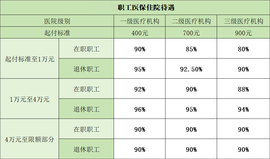 备注:一个自然年度內,第一次住院设置全额起付标准,第二次住院减半设置起付标准,从第三次住院不设起付标准,超过起付标准部分分段设置报销比例。纳入职工基本医疗保险支付的住院费用最高支付限额为24万元。超过24万元部分的政策范围內住院费用纳入职工大额医疗费用补助保障,年度最高补偿40万元。参保职工在各级中医院住院保障待遇的起付标准和支付比例按低一个级别医院的标准执行。