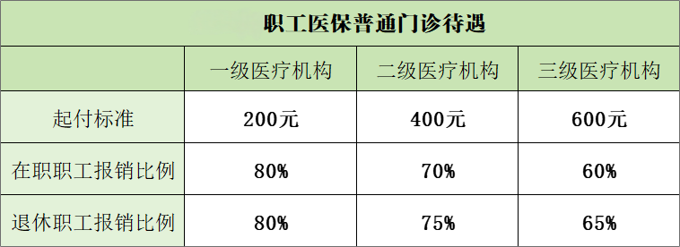 备注:一个自然年度內,起付标准累计计算,达到规定的相应级别医疗机构起付标准后不再计算。在职职工普通门诊待遇年度基金最高支付限额4500元(其中基本医保3500元,大额医疗费用补助1000元),退休职工普通门诊待遇年度基金最高支付限额5500元(其中基本医保3500元,大额医疗费用补助1000元)。参保职工在各级中医院门诊共济保障待遇的起付标准和支付比例按低一个级别医院的标准执行。
