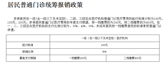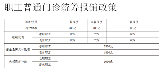 备注:一个自然年度內,起付标准累计计算,达到规定的相应级别医疗机构起付标准后不再计算。在职职工普通门诊待遇年度基金最高支付限额4500元(其中基本医保3500元,大额医疗费用补助1000元),退休职工普通门诊待遇年度基金最高支付限额5500元(其中基本医保4500元,大额医疗费用补助1000元)。